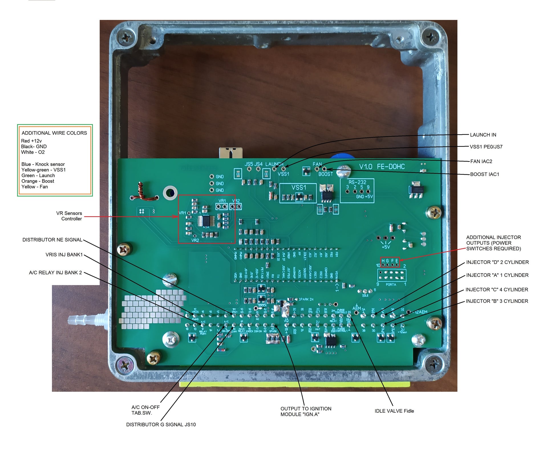 A special input is made for connecting the AEM O2 sensor, red +12v, black ground, white signal. +12 volts is supplied when the ignition is turned on.